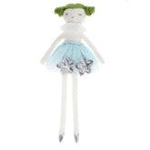 Cute princess plush doll named Amélie. Featuring long legs and green yarn hair, and wearing a pretty white faux fur collar, blue tulle dress with silver glittery star accessories, and silver glittery shoes, she makes an adorable companion for little ones.