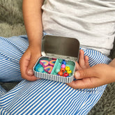 • Recommended for ages 3+ • Plastic free • Promotes fine motor skills • Perfect for till point add-ons • All materials provided • Ideal for party favours & stocking fillers • UKCA/UKNI/CE tested & FSC certified A beautiful gift tin containing elastic & beads to create this rainbow bracelet. The elastic comes with metal ends to aid the beading process for young children. The tin can be used to store the bracelet, or a special trinket. In a bid to banish plastic from our homes, Cotton Twist products are lovingly assembled by hand, & all components are as good as we can possibly make them. MATERIALS: Hinged tin, wooden rainbow beads, spherical beads, elastic with metal ends to aid beading. DIMENSIONS: gift tin measuring 81 X 53 X 16mm
